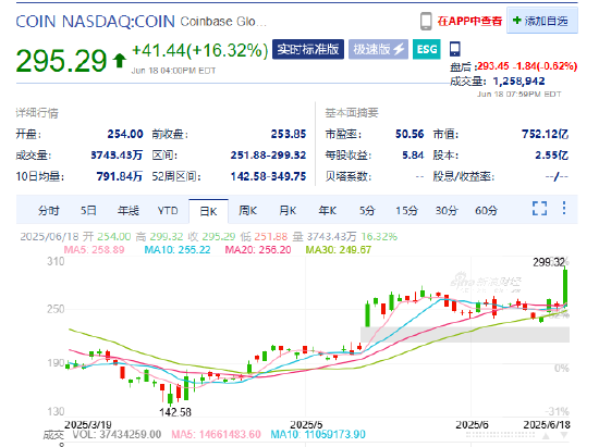6月18日美股收盘,Coinbase股价上涨16.32%。